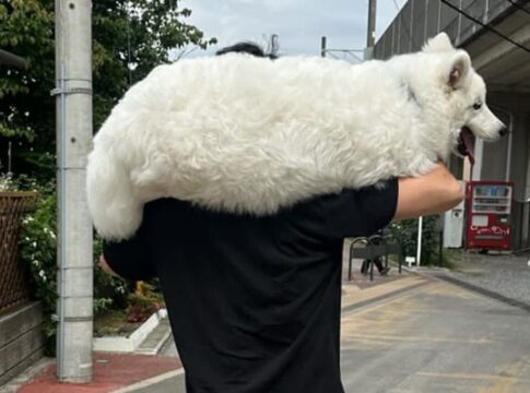 サモエドが散歩中に体力を使い果たし、飼い主に肩に乗せられて帰る姿が話題に。