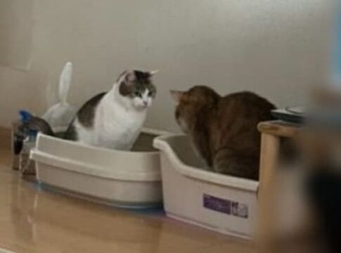2匹の猫が向かい合ってトイレで用を足す姿が話題に。仲良し姉妹ならではの光景がネットで反響を呼ぶ。