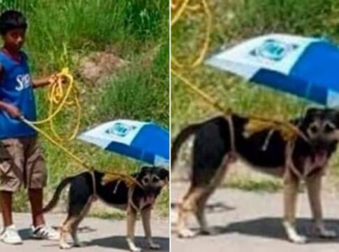 暑い日に犬と散歩する少年が、犬に傘をさしてあげた心温まる行動が話題に。