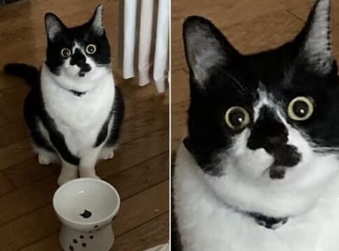 餌を食べた後でも飼い主に餌を求める猫の姿が話題に。無邪気な表情に笑いがこぼれる。