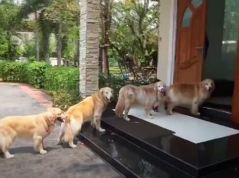 4匹のゴールデン・レトリバーが、足を拭いてもらうために玄関前で整列する様子が話題に。