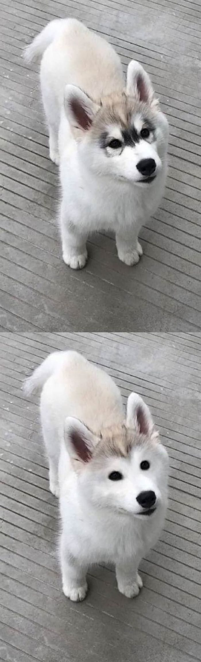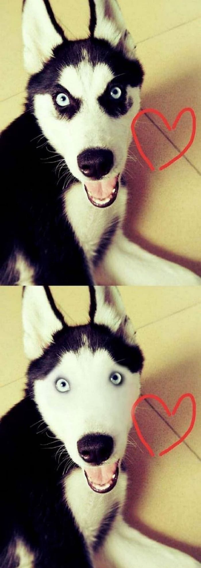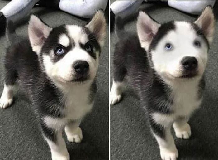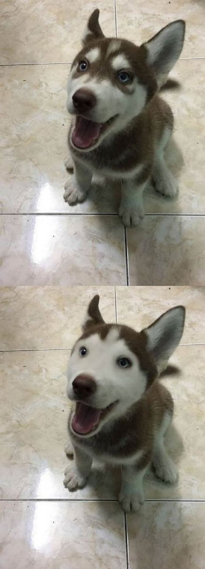 【引用:萌寵要當家のSNSアカウント】シベリアンハスキーを撮影した原本写真とフォトショップで目の周りの模様だけを削除した写真を比べてみるとどうだろうか。元々あったはずの「目のクマ」が消えると、まるで別の犬種を見ているかのような印象を受ける。目の周りの模様が消えると顔の余白は少々目立つが、犬の喜んでいる表情がよく見えて、とてもかわいい。