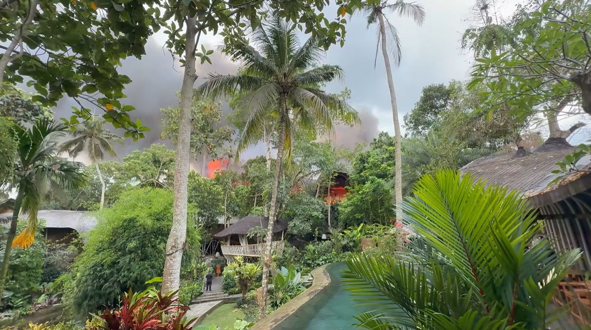 【引用:Youtube@sttravel39】すぐ近くで起きた火災ではなかったが、同じリゾート内で火事が発生したにもかかわらず、火災報知機は鳴らなかったとユーチューバーは語る。彼が荷物をまとめている間に、炎はどんどん大きくなり、隣のヴィラへと次々に燃え移った。ユーチューバーによると、午前10時55分頃に消防と警察が到着し、リゾートのスタッフも消火にあたった結果、次第に火の勢いは収まっていったという。彼が朝食をとったラウンジや、ロマンチックなディナーの舞台となった滝の近くも被害を受けていた。当初2泊の予約をしていたユーチューバーは、2泊目の滞在が不可能となり、別の宿泊先を探さざるを得なかった。インドネシアの日刊紙『コンパス』などによると、火災はこのリゾートの拡張工事現場で最初に発生したという。新築中のヴィラ1階のケーブルで電気スパークが起き、燃えやすい建築資材に燃え移り、強風にあおられて他の建物にも急速に広がった。