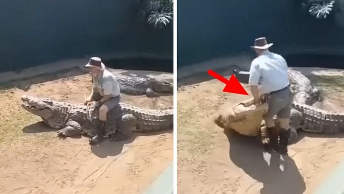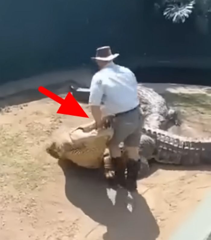 【引用:YouTube@BrianBarczyk】周囲の人々は不安そうに見守っていたが、飼育員は意に介さず、熟練の手つきで実演を続けた。皆が固唾を飲んで次の展開を見守る中、隣にいたもう1頭のワニが突然大きく口を開け、威嚇するように飼育員に迫った。飼育員は瞬時に体勢を整え、小型のワニを避けようとした。しかしその瞬間、乗っていた巨大なワニが激しく体をねじり、彼のズボンと左手を噛んで激しく放り投げた。