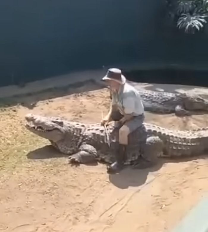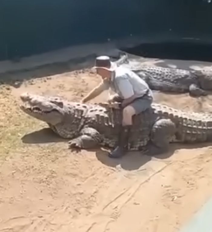【引用:YouTube@BrianBarczyk】巨大なワニ2頭がいる囲いに、一人の男性が入ってきた。つばの広い帽子にシャツとショートパンツを身につけた彼は、ワニ専門の飼育員らしい風格を漂わせていた。片手に長い棒を持っていたが、その表情には緊張感はなく、落ち着いた様子だった。観客に向けて説明を始めると、皆の視線が集まる中で、ためらうことなく巨大なワニの背に乗った。飼育員は、まるで従順な馬を扱うかのようにワニの頭を撫で、慎重に手なずける姿を見せた。