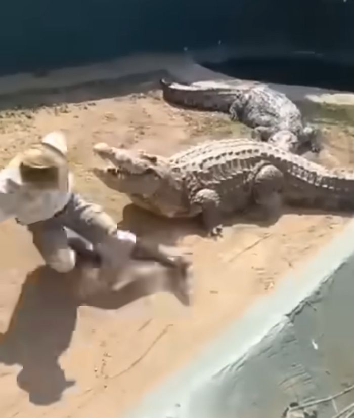 【引用:YouTube@BrianBarczyk】一瞬の出来事に観客は驚愕し、飼育員は地面に倒れたまま腰を曲げ、ため息をつきながら怪我がないか確かめた。幸い大きな怪我はなかったようだが、危険な瞬間をかろうじて乗り越えた後、しばらく呆然と座り込んでいた。この映像は、安全だと思われていた猛獣でも予測不可能な事故が起こりうることを如実に示している。専門家によれば、ワニは飼いならすことができない動物であり、ワニ専門の飼育員はこれまでにも数多くの事故に晒されてきた。