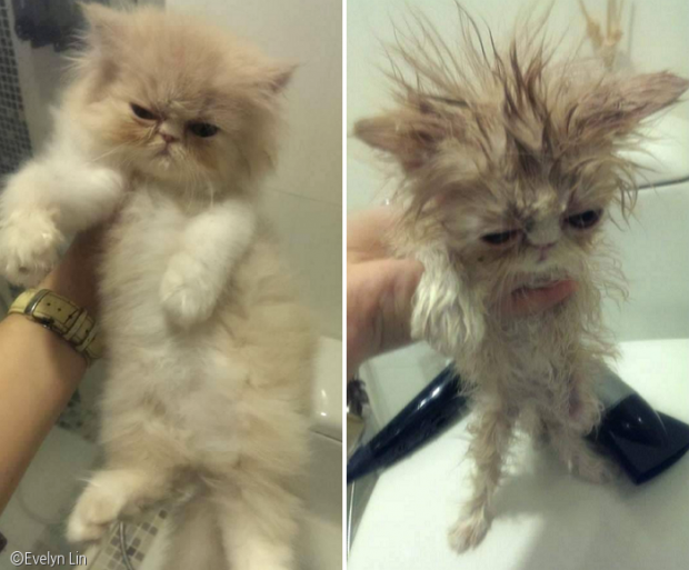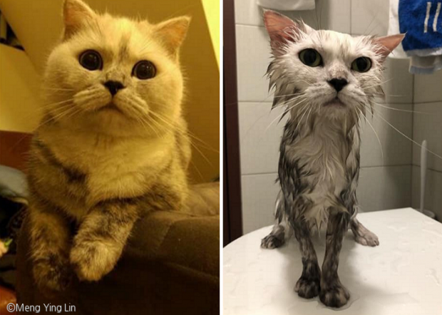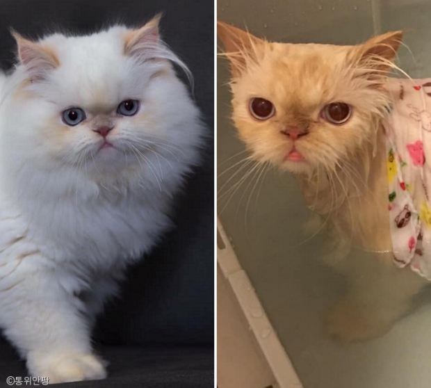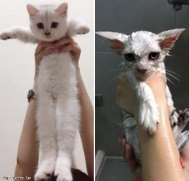 【引用:SNS】しかし、お風呂の時間に水をかけた瞬間、同じ猫とは思えないほどショッキングな姿へと変わった。小さな目、やせ細った顔、普段より大きく見える鼻、そしてこれまでの豊かな毛に隠れていた長い足が姿を現した。