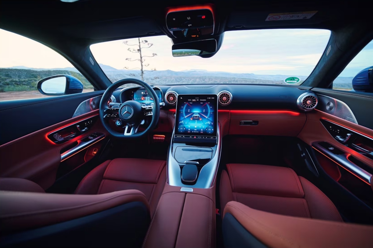 【引用:メルセデス・ベンツ】インテリアは2+2シートと675Lのラゲッジ容量を確保。11.9インチのタッチディスプレイを中心に、AMGトラックペース、ナッパレザーステアリング、ブルメスター製オーディオ、パノラミックルーフ、ワイヤレスCarPlay/Android Autoなど最新装備を網羅する。