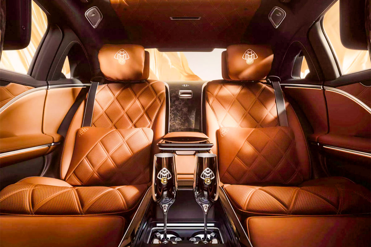 【引用:メルセデス・ベンツ】内装はサドルブラウンのナッパレザーとウォールナットウッドトリムで構成。後席コンソールにはゴールドインレイを用いた専用デザインが施され、仕上げには最大7日間の手作業を必要とする。ルーフライナーのダイヤモンドキルティング、センターコンソールの「1 of 50」バッジなど細部にまで匠の技が込められており、シルバーのシャンパングラスや専用キーケースなど豪華な付属品も用意される。