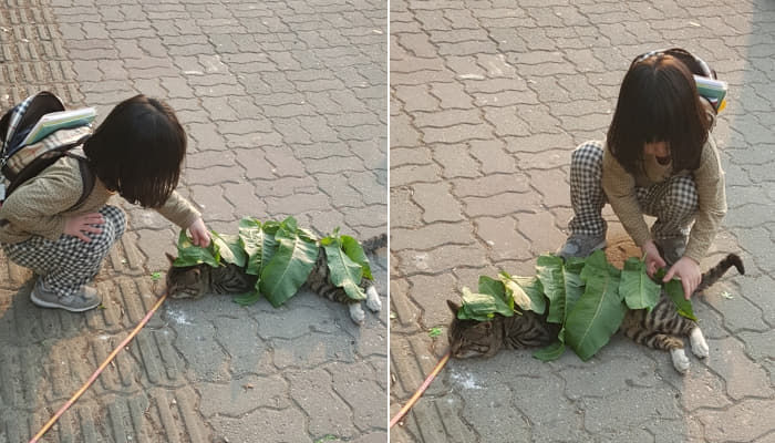【引用:オンラインコミュニティ】それはまるで――無邪気な友の眠りを守るためにそっと広げられた、小さな毛布のようだった。その優しい手の主を探してあたりを見回すと、そこには通りかかった一人の幼い少女がいた。彼女は、冷たい地面で眠る猫が寒くないかと心配になり、近くの葉を一枚ずつ集めては、慎重に背中へかけていたのだ。