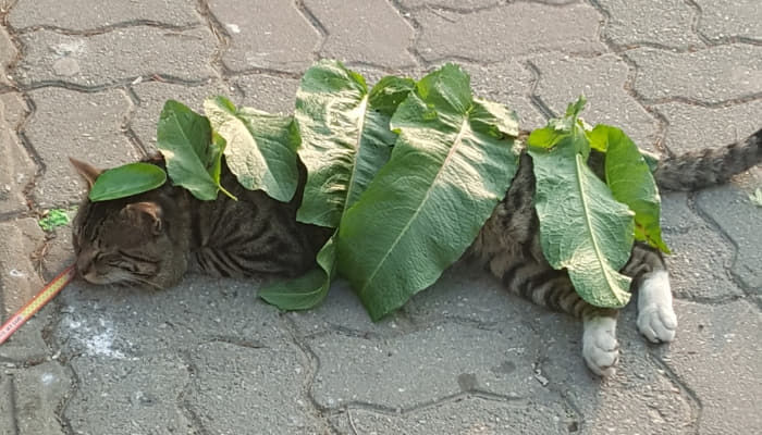 【引用:オンラインコミュニティ】歩道の上で、思わず足を止めるような愛らしい光景に出会った。道の真ん中で、気持ちよさそうに眠り込む一匹のキジトラ猫。しかしその姿は、どこか特別だった。まるで誰かが丁寧に布団をかけたかのように、猫の背中には大きく青々とした葉がいくつも並べられていた。