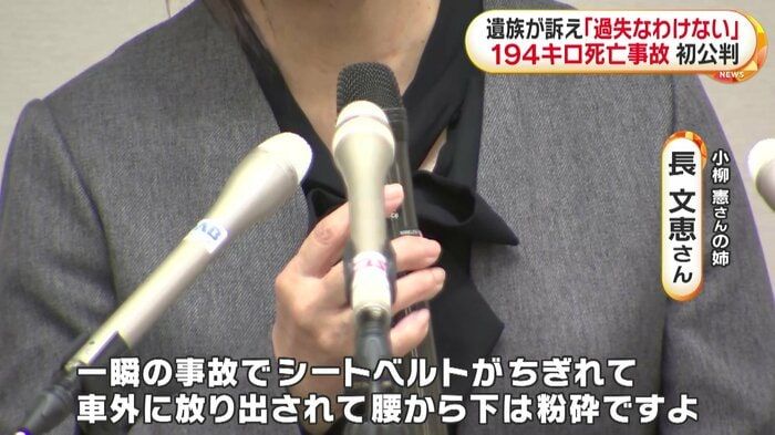 【引用:イット】小柳憲さんの姉・長文恵さんは、「一瞬の事故でシートベルトがちぎれて、車外に放り出され、腰から下は粉砕状態だった。最高速度194km/hのこの事故が単なる過失であるはずがない」と語った。審理は計6回行われ、判決は今年11月28日に言い渡される予定である。