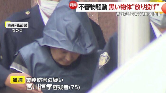 【引用:FNN】警察は映像などから弘前市内に住む自称無職の宮川恒孝容疑者(75)を特定。警察の業務を妨害した疑いで逮捕し、16日に送検した。宮川容疑者は警察の調べに対し、「不審物を置いたことは認めるが、業務を妨害するつもりはなかった」と一部容疑を否認しているという。