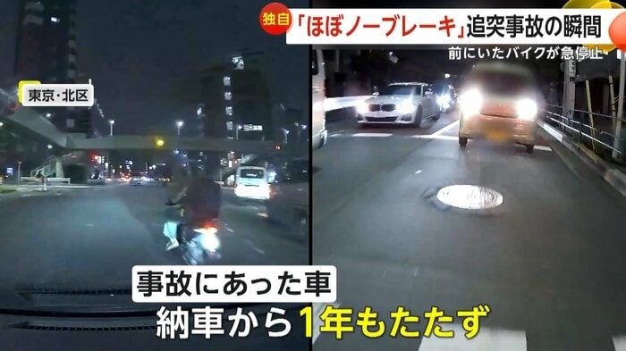 【引用:ビデオPost】東京・北区の交差点で15日夕、バイクの急停止がきっかけで軽自動車が前方の車に追突する事故が発生した。現場の防犯カメラには、青信号が黄に変わる瞬間、バイクが突然停止し、慌てて減速した前方車両に後続の軽自動車が激しく衝突する様子が捉えられていた。