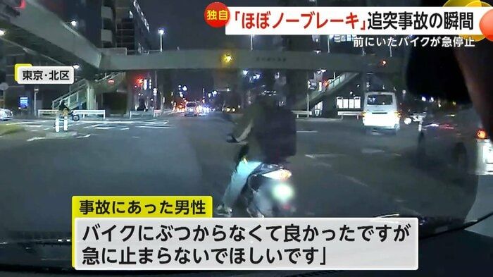 【引用:ビデオPost】追突した軽自動車の運転手は現場で「ほぼノーブレーキでした」と謝罪した。警視庁は物損事故として処理したが、衝撃の大きさから被害車の運転手は首や腰に痛みを感じ、現在も違和感が残っているという。専門家は「信号が黄に変わる瞬間は、前後の車両の判断が分かれやすく、最も事故が起きやすいタイミング」と指摘。特にバイクは急停止すると後続車から視認しづらいため、交通量の多い交差点では無理な急ブレーキを避け、周囲の状況をよく確認することが重要だとしている。