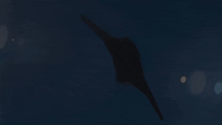 【引用:シールドAI】X-BATは前面が三角形状に折れ曲がった「クランクド・カイト」形状で、巨大なエイを連想させるブレンデッドウィング(翼胴一体型)構造である。機体の長さは約8m、翼幅は12m、高さは1.4mで、単一のジェットエンジンを搭載し、航続距離は3,700km以上、実用上昇高度は約15km程度である。