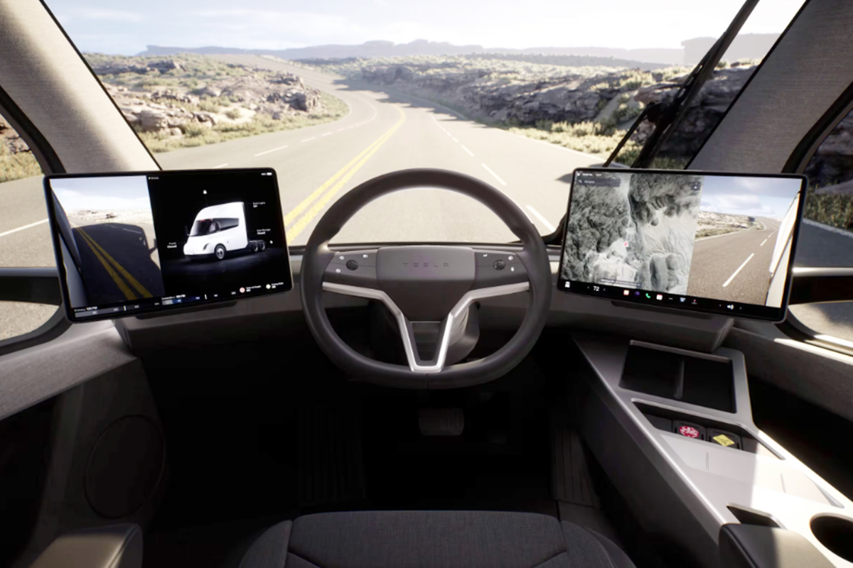 【引用:テスラ】運転席は中央に配置され、航空機の操縦席を思わせる設計だ。左右の15インチデュアルディスプレイから走行情報、ナビ、バッテリー管理を統合制御できる。自動運転機能「FSD Trucker」は高速道路での自動走行や車線変更に対応し、運転者の負担を劇的に軽減。空力性能はCd0.34を誇り、一般的なスポーツカーをも下回る数値を実現した。