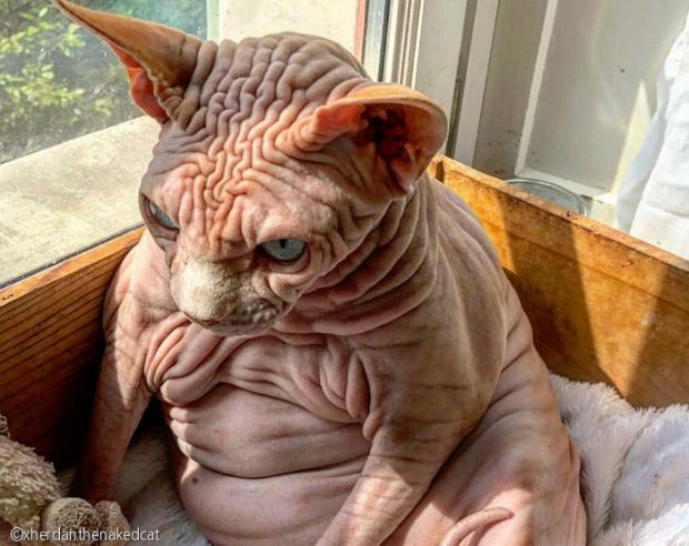 【引用:instagram@xherdanthenakedcat】スイス・リュティ(Rüti)地方に住む女性サンドラ・フィリッピ(Sandra Filippi)は、頭から足の先まで深いシワを持つスフィンクス猫「シェルダン」の飼い主だ。シェルダンは、他のスフィンクス猫に比べてシワが多く、深く刻まれているため、非常に怒っているように見える。365日、眉間にシワを寄せているのはもちろん、カメラや飼い主を見つめる時も、まるで不機嫌そうな表情でカメラを見つめる。