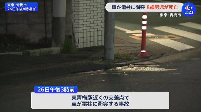 【引用:フジテレビ社会部】東京・青梅市で26日午後、乗用車が電柱に衝突する事故が発生し、車に乗っていた男児が死亡した。警察が詳しい事故原因を調査中である。事故は午後3時前に起きた。現場はJR東青梅駅近くの交差点で、車は制御を失ったように歩道に乗り上げ、電柱に正面衝突した。衝撃によりフロント部分は大きくへこみ、ボンネットが押し上がるように変形したという。