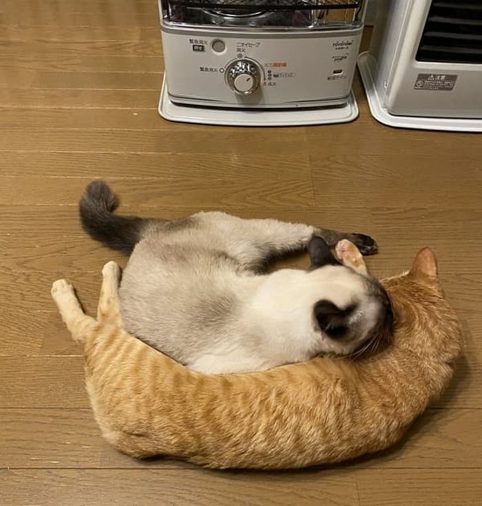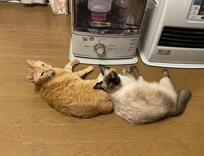 【引用:X@Oa1Un】寒い日が続く中、1号くんと2号くんのお気に入りの場所は何といってもヒーターである。ヒーターにスイッチが入るとすぐさま前に陣取り、目を細めて温もりを堪能する姿がかわいらしい。しかし、あまりに近づきすぎていたため、飼い主は猫たちの健康を心配してヒーターを少し後ろに移動させた。そうすると猫たちはじわじわと前へとにじり寄り、もっと近くから暖を取っていたという。