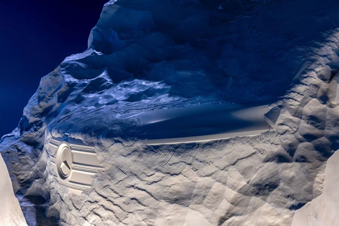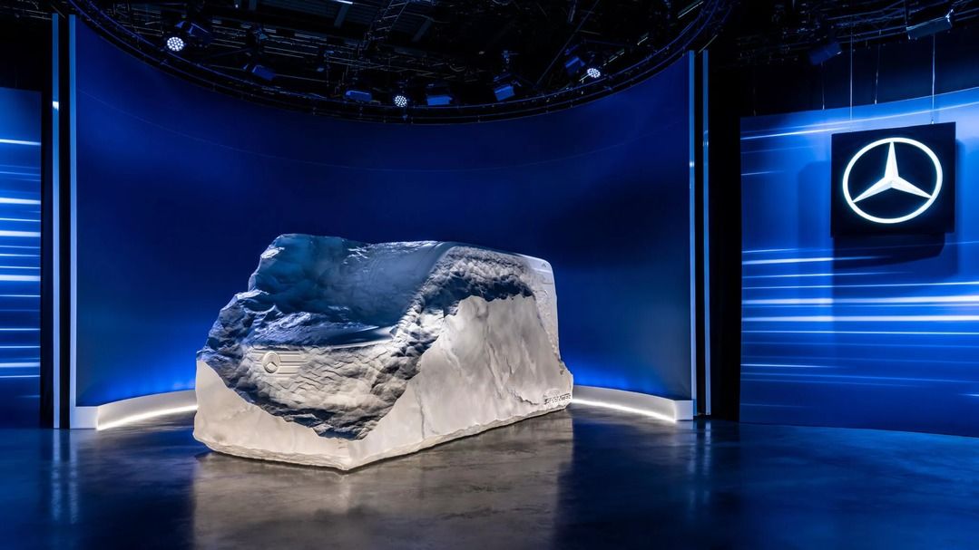 【引用:メルセデス・ベンツ】「THE BOuLDER」はその名が示す通り、岩を象った巨大な造形作品である。メルセデスはこの造形を長年培ってきた堅牢性、信頼性、耐久性の象徴として位置づけ、次世代スプリンターのデザイン言語を先行的に体現する造形的ティーザーと説明している。