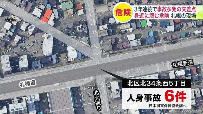 【引用:FNN】札幌市北区の北34条西5丁目にも、もう一つの「魔の交差点」がある。高架下に位置する複雑な五差路で、2024年にはここでも6件の人身事故が発生した。歩行者からは「車がどの方向に曲がるのか分かりづらい」との声が上がっており、見通しの悪さと車線の多さが危険を増幅させている。