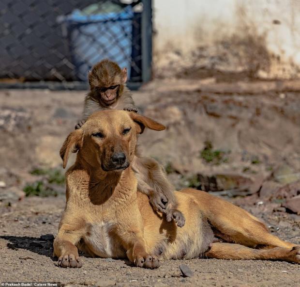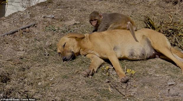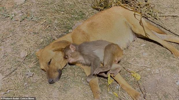 【引用:YouTube@CatersClips】バダル氏は「子ザルの母親は農作物を荒らしたとして人々に毒を盛られ命を落とした際、まだ生後10日ほどだったようだ」と語った。「母親を失ったものの、奇跡的に生き延びた子ザルは犬の母親が子ザルをそっと抱きしめ、自分の子のように守った」と続けた。