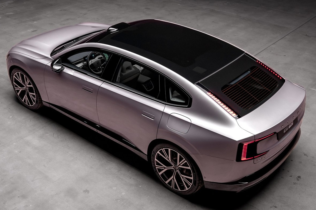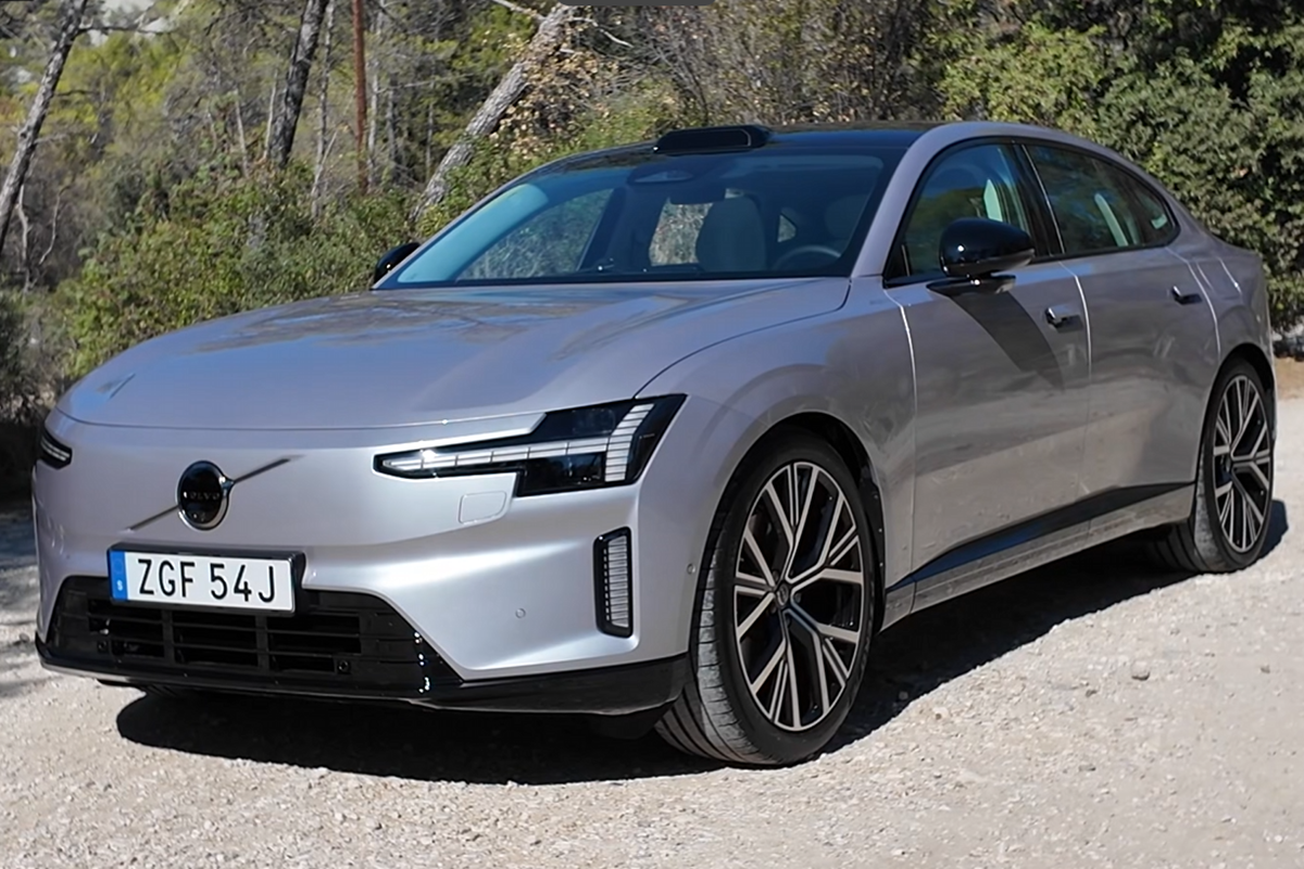 【引用:ボルボ】外観はセダンながら室内空間はSUV並みで、全長5m、車高1,550mm、ホイールベース3,102mmと堂々としたサイズ感を持つ。緩やかなクーペ型ルーフで空気抵抗係数0.25Cdを実現し、ブランド史上最高の空力性能を誇る。テールゲートはガラス一体型のハッチバック構造で、ファミリー用途にも適した高い実用性を確保した。ボルボは「家族旅行にも使えるセダンを作りたかった」と説明している。