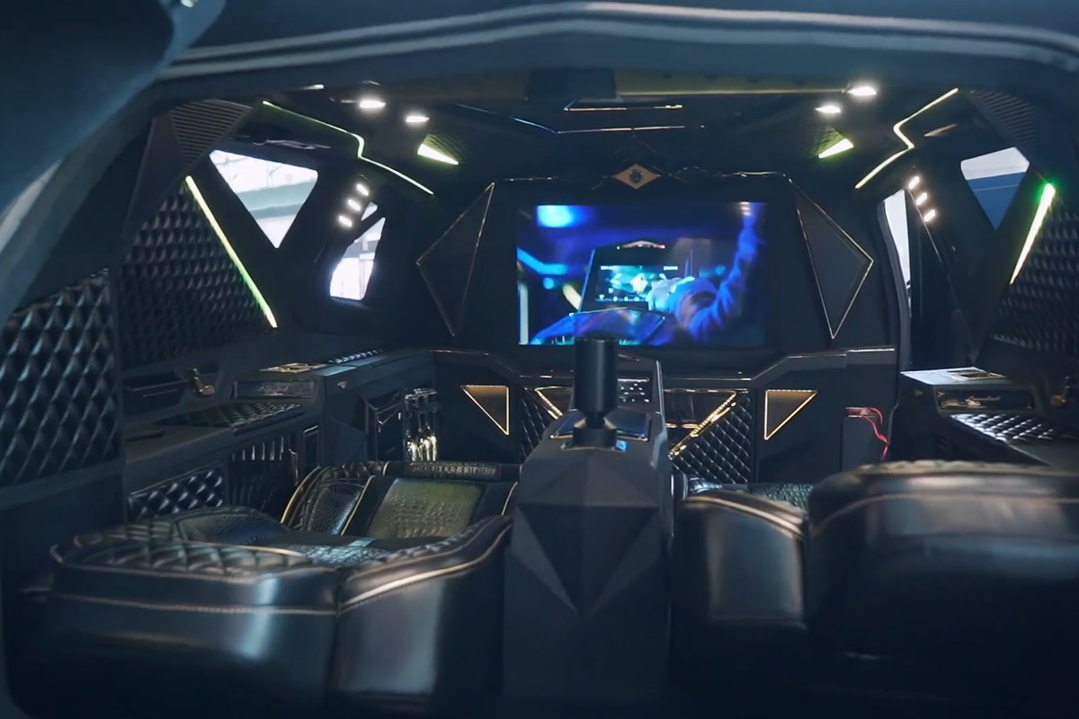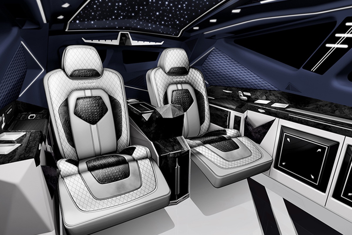 【引用:YouTubeチャンネル「Karlmann」】キャビンに入ると、まるで個人ジェット機のような空間が広がる。金メッキ装飾や人工ダイヤのインレイ、手縫いレザーシート、大型4Kテレビ、ミニバー、ムード照明などが標準装備。さらにプレイステーション4、衛星電話、ワインセラー、コーヒーマシンなどのオプションが用意され、顧客の希望に応じて色や照明、刺繍ロゴまでカスタマイズできる。価格は基本仕様で約200万ドル、フルオプションでは380万ドルを超える。