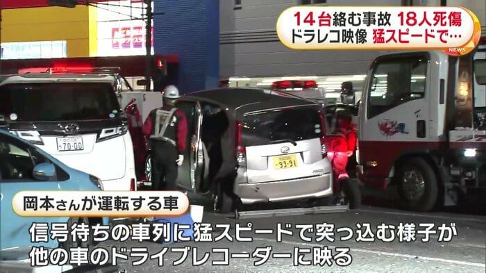【引用:FNN】警察の調べによると、岡本さんの車が信号待ちをしていた車の列に猛スピードで突っ込む様子が、衝突された車のドライブレコーダーに記録されていた。ブレーキを踏んだ形跡はほとんどなく、車は次々と前の車に追突しながら停止したとみられる。同乗していた男性の話によると「死亡した男性は事故の直前に意識を失い、ハンドルにもたれかかっていた状態だった」という。