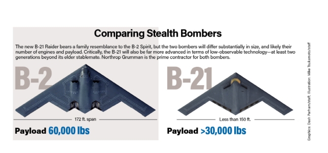 【引用:米空軍】公開されている範囲の情報をまとめると、B-21の翼幅は約45.72メートル以下で、B-2の52.43メートルより小型化されている。搭載可能重量もB-2の約27トンに対しB-21は約13.6トンと報じられている。機体規模や搭載量は縮小する一方で、精密誘導兵器やスマート化された核兵器の進化により大量の搭載を必要としないとの専門家の説明がある。