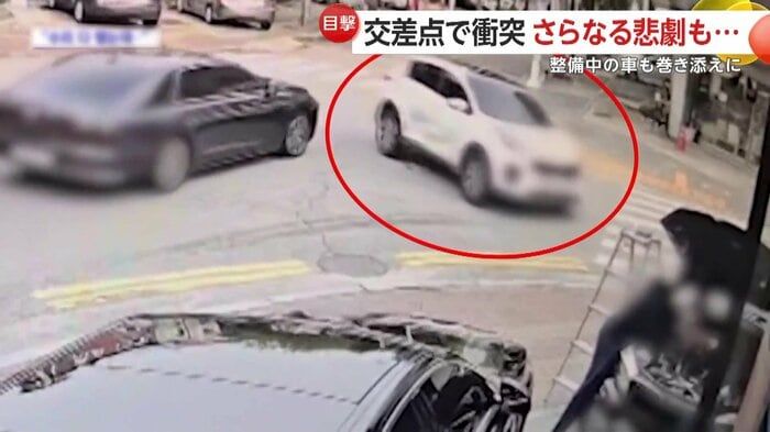 【引用:FNN】当時、整備士が作業中だった。白い車は整備中の車に追突した。