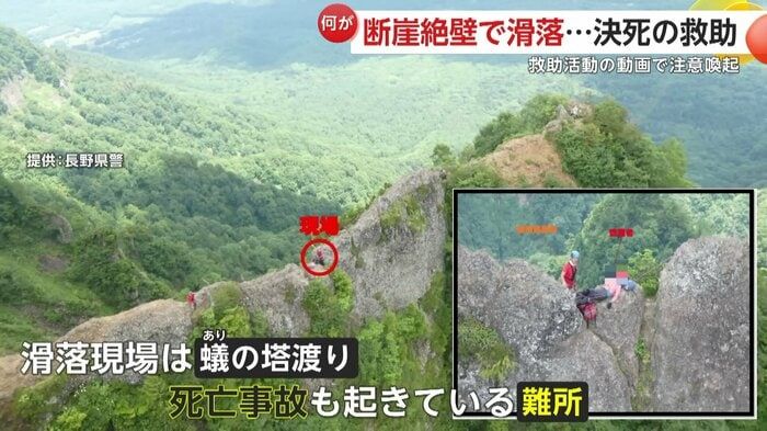 【引用:イット!】動画は、2025年7月に戸隠山で発生した滑落事故の救助活動を収めたものである。事故現場は尾根にある「蟻の塔渡り」と呼ばれる難所で、幅が極端に狭く、過去には死亡事故も起きているルートである。