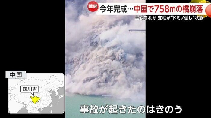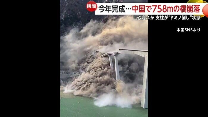 【引用:FNN】四川省で起きた橋の崩落では、758メートルに及ぶ国道の橋脚がドミノ倒しのように次々と崩れ落ち、舞い上がる砂埃の中へと消えていく映像が複数の目撃者によって記録された。橋は四川省の中心部とチベットを結ぶ重要路線で、2025年初めに完成したばかりだった。11日に発生した事故後、橋の下は崩れたコンクリート片が広範囲に散乱し、無残な姿を晒した。