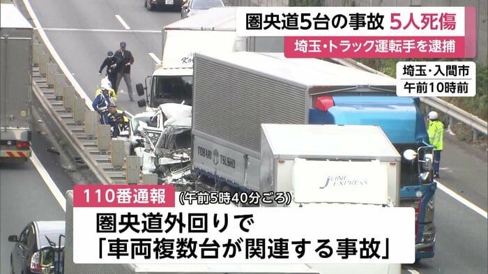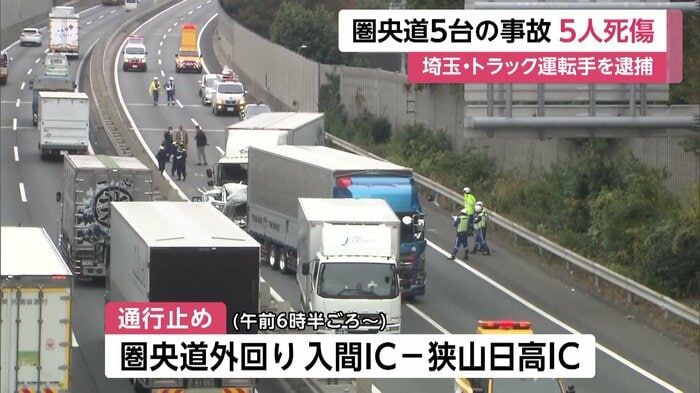 【引用:FNN】埼玉県・入間市の圏央道で、トラックと乗用車など計5台が絡む事故が発生した。この事故で2人が死亡し、3人が負傷した。