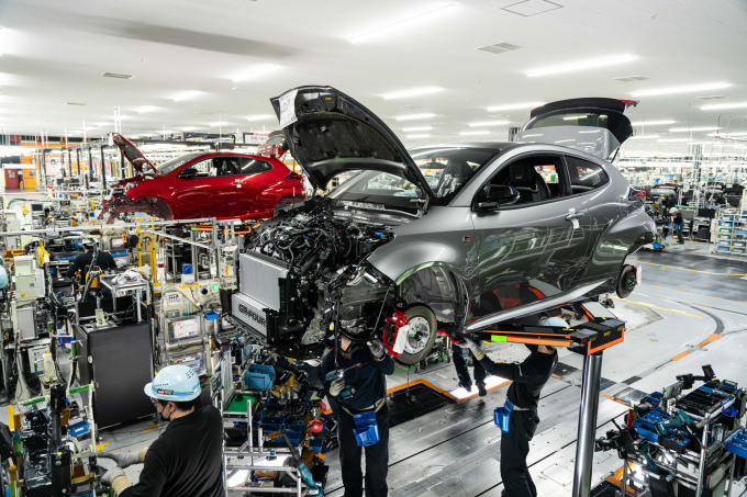 【引用:トヨタ】車両はボディ・組立・検査の3工程を経て仕上げられる。GRヤリスでは一般ヤリスより約15m長い、総35mの構造用接着剤を使用し、ねじれ剛性を強化。溶接ポイントも多く、スポット溶接などの精密作業はロボットが担当する。組立工程では、選抜されたトヨタの匠が細部を仕上げる。AGVは必要に応じて最大9分停止し、揺れのない状態で部品を組み付けることができる。さらに、下部部品を先に正確な位置へ配置し、車体を上から下ろして結合する「下部搭載工程」を採用し、実走行条件に近い状態で組立精度を高めている。