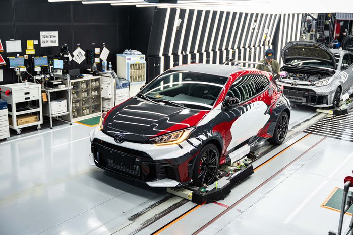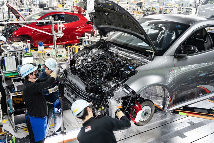 【引用:トヨタ】工程はセル単位で構成され、AGVが車体を次工程へ搬送する。ボディ溶接ではGR専用として一般車より約500点多いスポット溶接が施され、剛性向上が図られる。組立段階では測定システムが導入され、車体下部のホール位置を3次元で0.1mm精度まで測定し、1万通りの組み合わせから最適値を算出する精密制御が行われる。