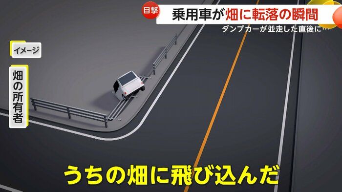 【引用:イット!】畑の所有者は、ダンプカーが車線に復帰しようとした際に乗用車を完全に抜き切れていなかった可能性を指摘。「コントロールを失ったまま畑に飛び込んだのだろう」と状況を推測した。また、乗用車の運転手とは顔見知りで、事故後の容体についても言及した。