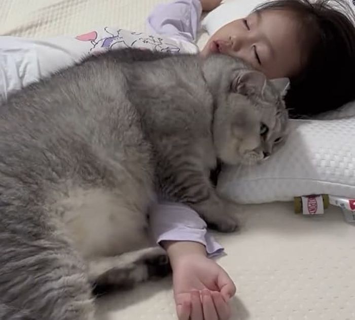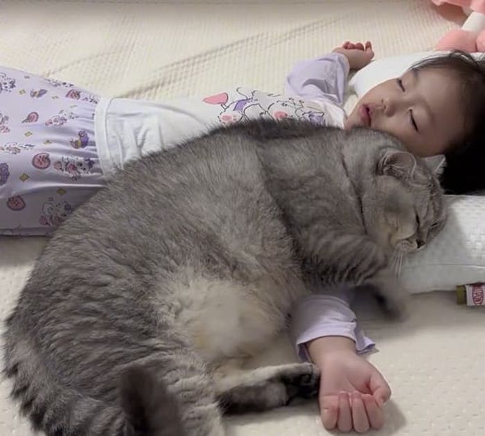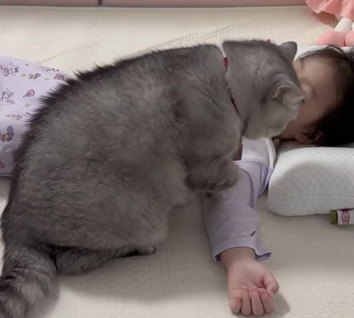 【引用:Weibo】飼い主によると、2歳になる娘が眠る際には昼夜を問わずぴったりと寄り添い、まるで小さな守護天使のように一緒に眠り続けるという。子どもが眠りについた後も決してそばを離れないその姿は、実に健気で印象的である。ある日、飼い主に少しいたずら心が芽生え、「ねえ、たまにはお母さんのところにもおいで」と声を掛け、猫から引き離すように子どもを抱き上げた。