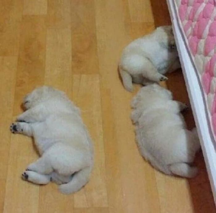 【引用:オンラインコミュニティ】まるでこんがり焼けたきな粉餅がふにゃふにゃ溶けていくように、犬たちは床にぺたんと体をくっつけ、世界中の平和をかき集めたかのように深い眠りに落ちていた。何度見ても、あまりにもかわいくて愛らしい姿に、飼い主は「本当にたまらない、たまらないな!」とつぶやくばかりだったという。暖かい床に全身を任せてぐっすり眠る犬たちの姿は、まさに最高の「癒し画像」だ。