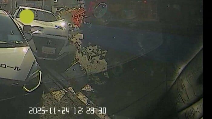 【引用:FNN】停止中の青いトラックの背後から、白い車が猛スピードで突っ込み、2台に追突する瞬間が映っている。衝撃でトラックは前方に押し出され、積み荷が道路に散乱する様子が確認できる。その直後、追突した白い車はまだ動いているにもかかわらず、車内から男が飛び出し、現場から逃走する姿が捉えられている。