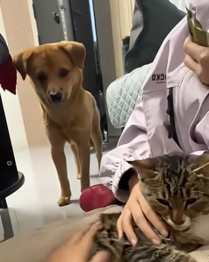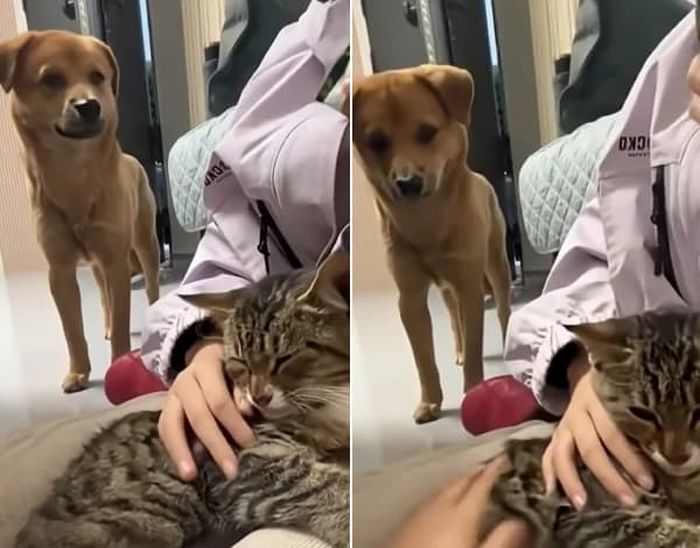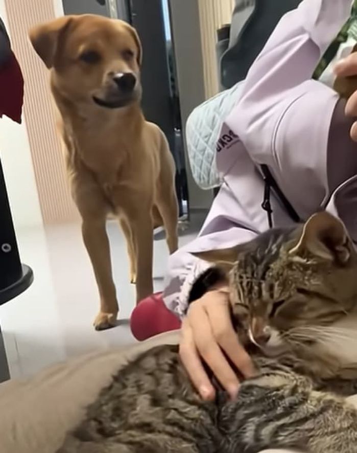 【引用:Catherine Ren】事情はこうだ。SNSには、ある飼い主の自宅で撮影された映像が投稿され、多くの関心を集めた。この家では、可愛い猫と犬が一緒に暮らしている。ところが飼い主は猫だけを抱きかかえ、優しく撫で続けていた。そのそばにいた黄色い毛並みの犬は、こうした様子を目にして深い寂しさを覚えたようだ。