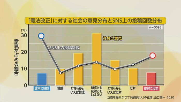 【引用:FNN】それでも一部の声が大きく見えるのは、SNS特有の“極端な意見が増幅される構造”があるからだ。憲法改正を巡る7段階の意見調査では、社会全体とは逆に、SNS上では極端な立場の投稿が多く、強い思いを持つ人ほど大量に発信する傾向が確認された。