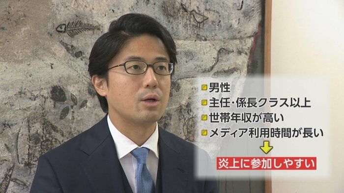 【引用:FNN】誹謗中傷を書く人物について、街の声では「余裕がない」「若い人」「仕事をしていなさそう」「ひきこもり」といったイメージが語られた。しかし研究結果はこれを覆すものだった。「男性で、主任・係長クラス以上、年収が高い層の方が炎上に参加しやすい傾向があった。無職や引きこもりといったステレオタイプとは異なり、多様な属性の人が加害者になり得る」と山口准教授は指摘する。