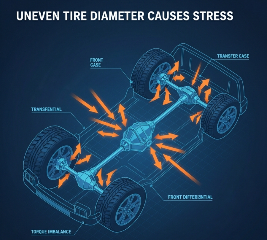 【引用:AI生成】特に駆動輪に摩耗差のあるタイヤを組み合わせると、左右の荷重配分が変わり、車両が片側へ引っ張られたり制動距離が延びる恐れがある。四輪駆動(4WD・AWD)車の場合、外径差はさらに深刻で、駆動系に過負荷をかけ重大な損傷につながる可能性が高い。