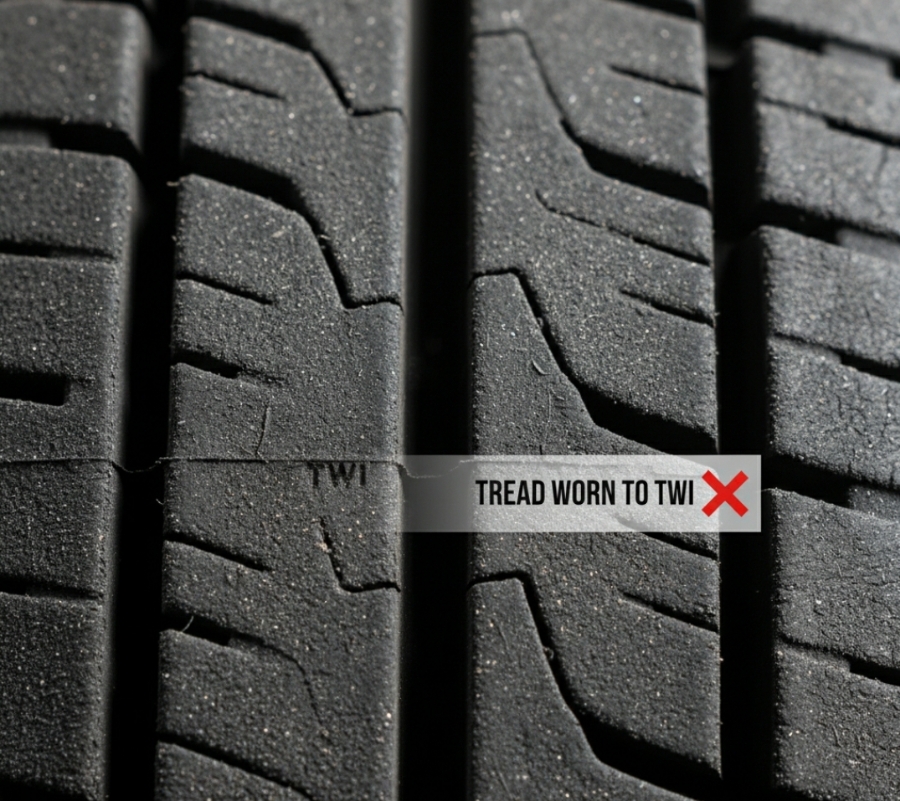 【引用:AI生成】交換基準として最も簡単な指標が摩耗限界線だ。タイヤ側面の三角マークに合わせてトレッドを確認し、その盛り上がり部分まで摩耗していれば、すでに寿命を迎えている状態。新しいタイヤを組む際も、既存タイヤとのトレッド差を測定することが重要だ。