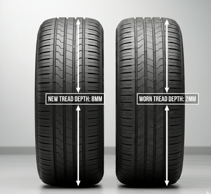 【引用:AI生成】一般的には新品と既存タイヤの溝差が3mm以上なら、同一軸の2本を同時に交換することが推奨される。外径とグリップ力がそろっているほど、車両の姿勢安定性と制動性能をより確実に保てるためだ。
