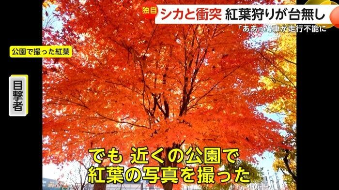 【引用:イット!】目撃者は「『ブヒッ!』と言いながら逃げていった。ショックだった。かなり衝撃が強かったので、これは修理費がいくらかかるのかと思った」と話した。ひび割れたバンパーの修理費用は約12万円になるという。シカと車が衝突も夫婦は観光を楽しむ 一方、栃木・日光市の上三川町の路上で15日午前5時半頃、紅葉を見に行こうと早朝に出発した夫婦のカメラが捉えたのは、中央分離帯から飛び出してきたシカだった。