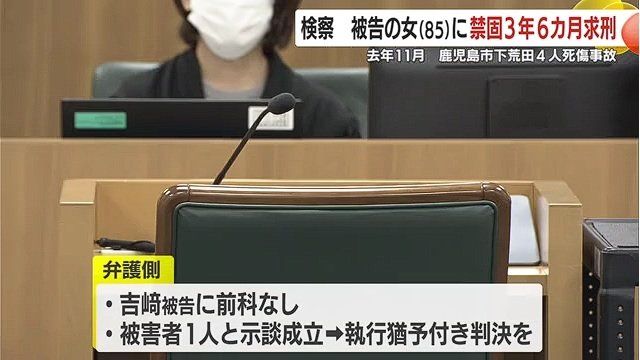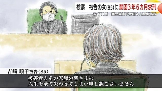【引用:FNN】2024年11月、鹿児島市で4人が死傷した事故をめぐる裁判で、ブレーキとアクセルの踏み間違いにより車を暴走させたとして過失運転致死傷の罪に問われている85歳の女に対し、検察が禁錮3年6カ月を求刑した。足早に鹿児島地方裁判所の法廷へ向かったのは、過失運転致死傷の罪で起訴された吉崎順子被告だ。起訴状などによると、吉崎被告は2024年11月、鹿児島市下荒田1丁目で普通乗用車を運転中、交差点を右折する際にブレーキとアクセルを誤って踏み間違え、横断歩道や歩道にいた男女4人をはねたとされる。この事故で、歩道にいた鹿児島県姶良市の会社員・今西和隆さんが死亡し、他の3人も重傷を負った。