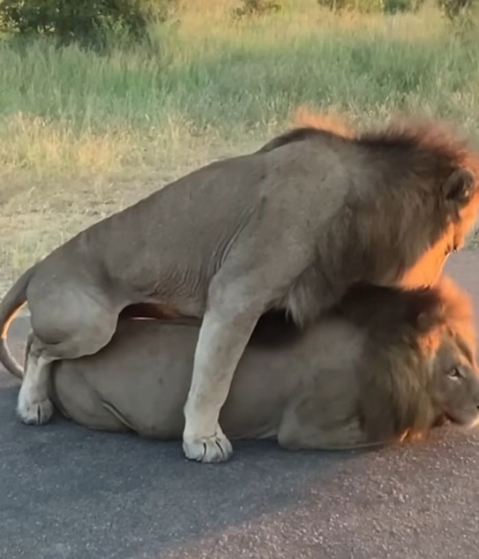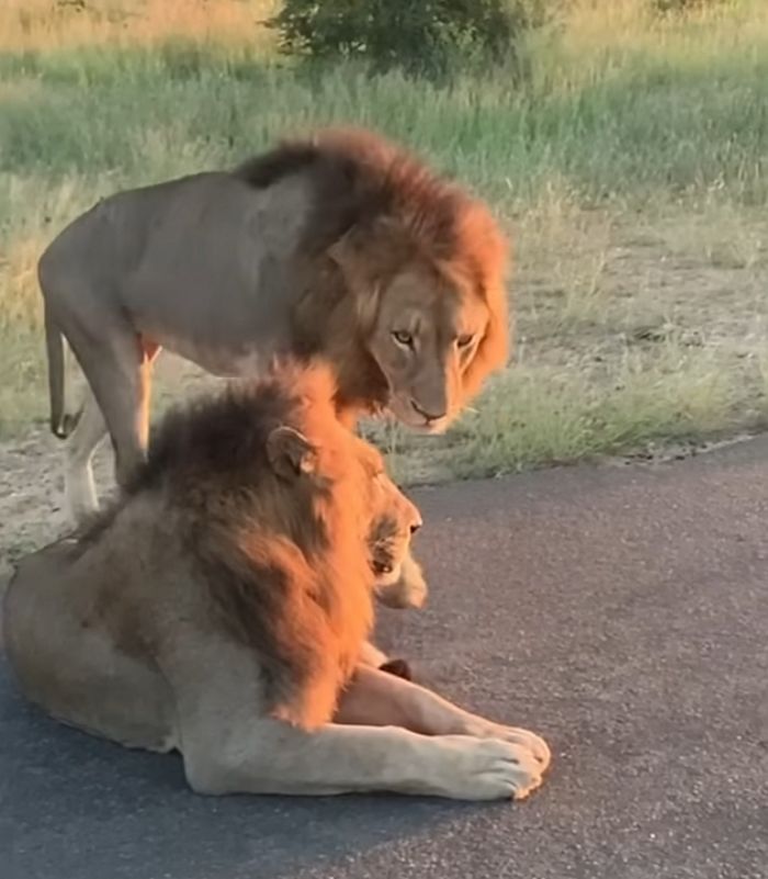 【引用:Youtube@Latestsightings】やがて、予想外の光景が現れた。立っていたオスライオンが、横たわっていたオスライオンの上に乗った。オスライオンは通常、群れの主導権争いや縄張り防衛の行動で知られる。この行動は、周囲に強い驚きを与えた。